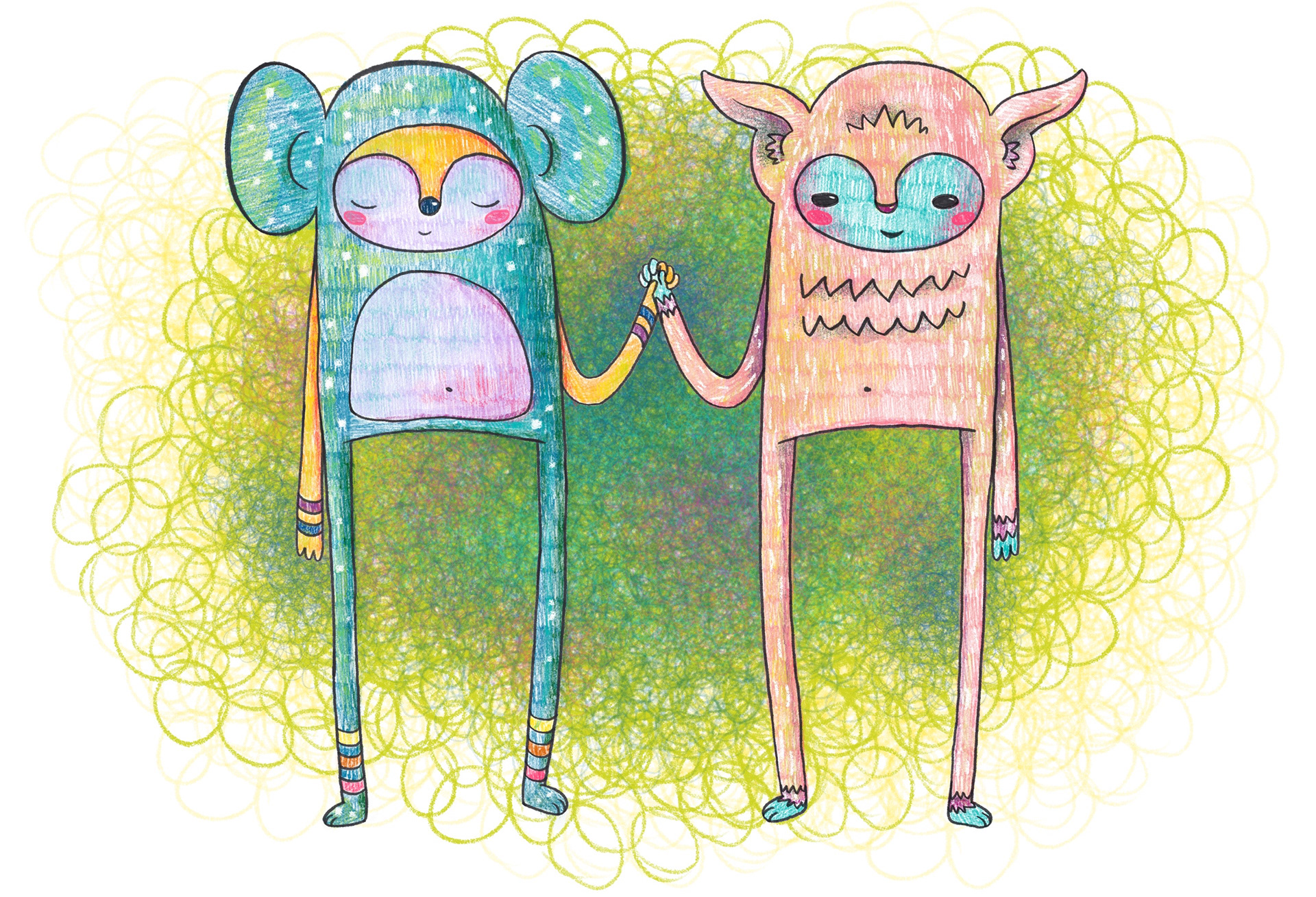 Below: Sea monster, fox, and reindeer creatures, original characters.