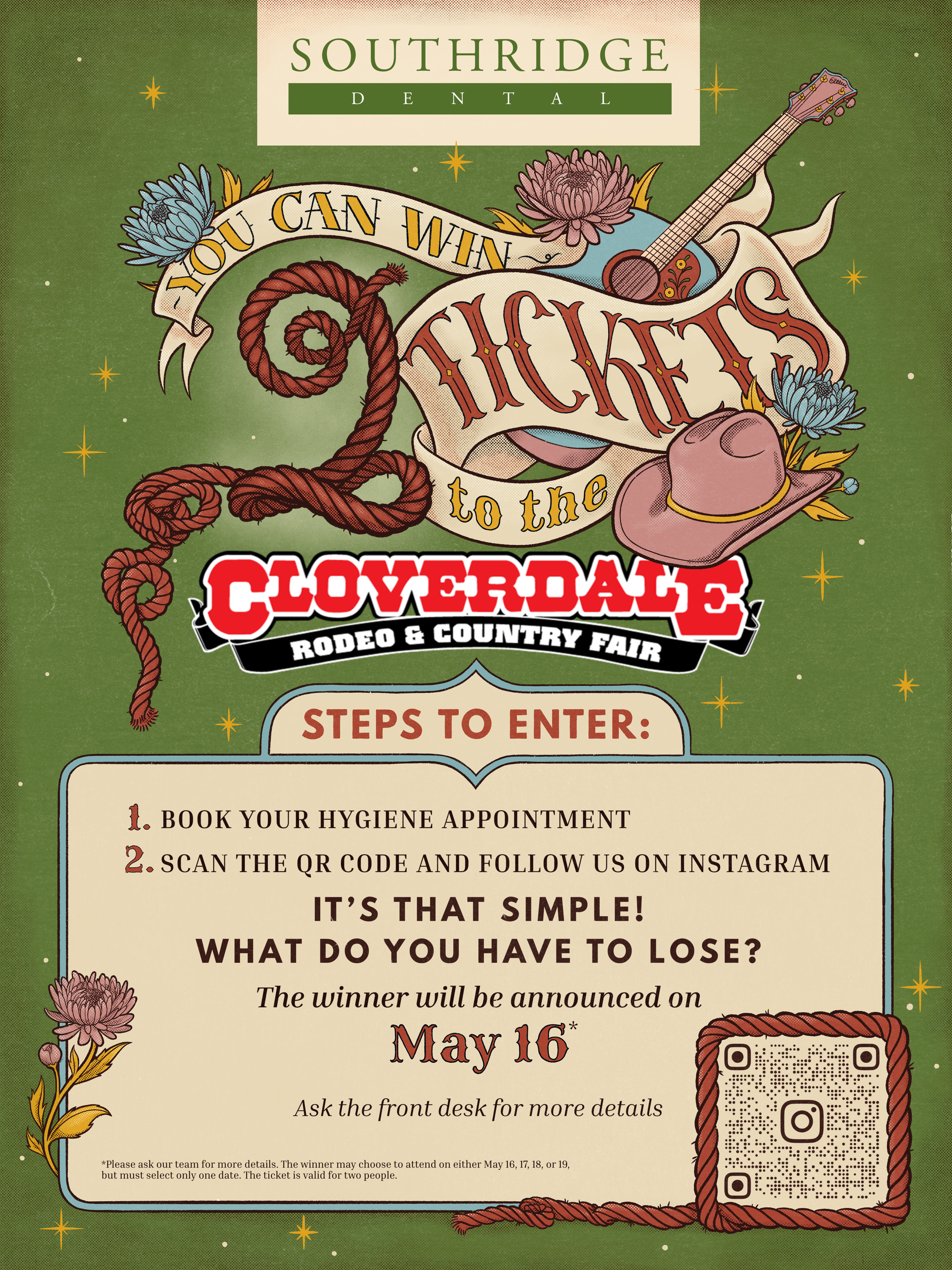 A custom poster for the Southridge Dental clinic's giveaway event, with illustrations and handlettering complimenting the theme of Cloverdale Rodeo & Country Fair to which you could win tickets — but in the clinic's brand colours.