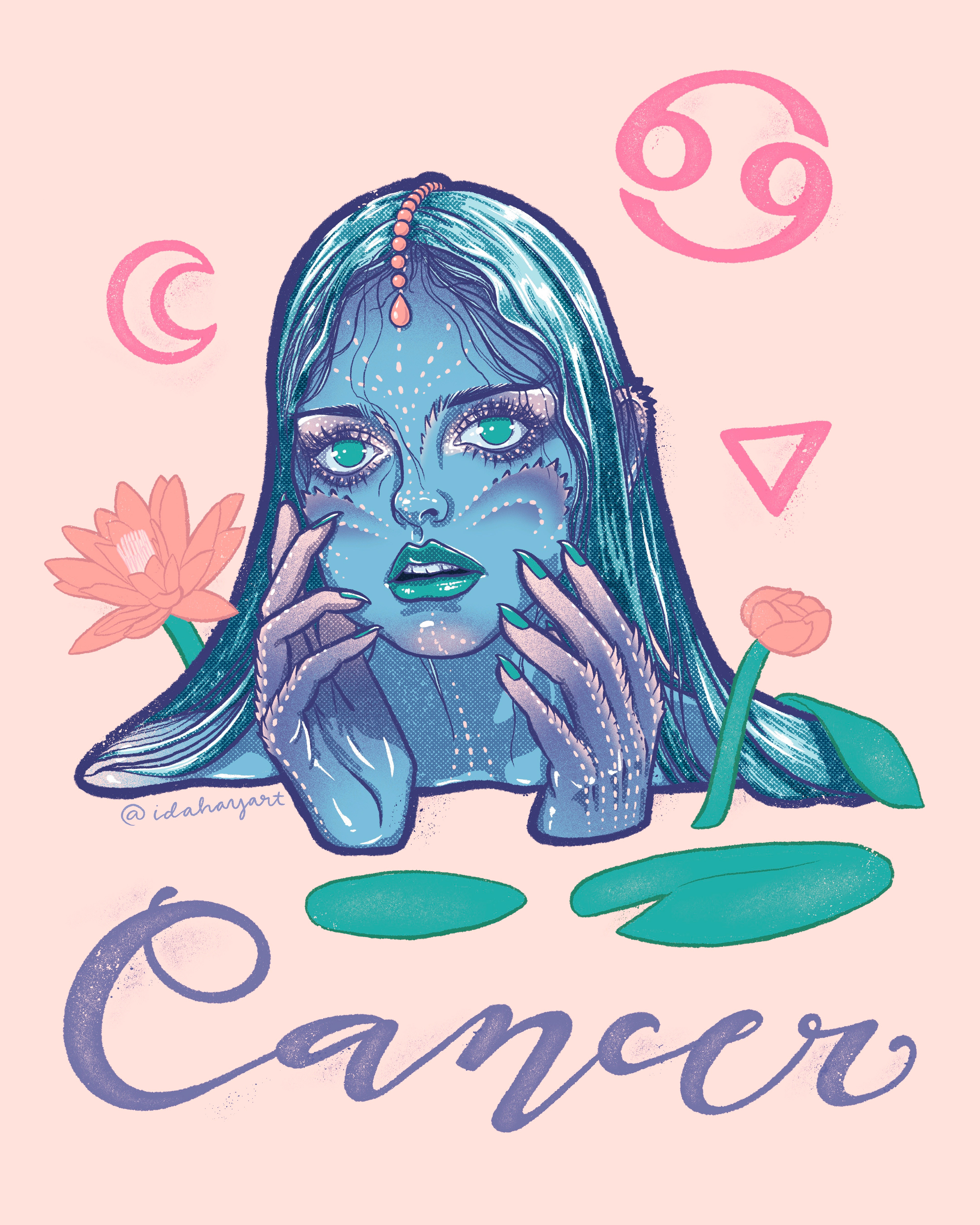 Cancer, the fourth of the Zodiac signs. Watery, ruled by the Moon. Birthdays June 21–July 22.