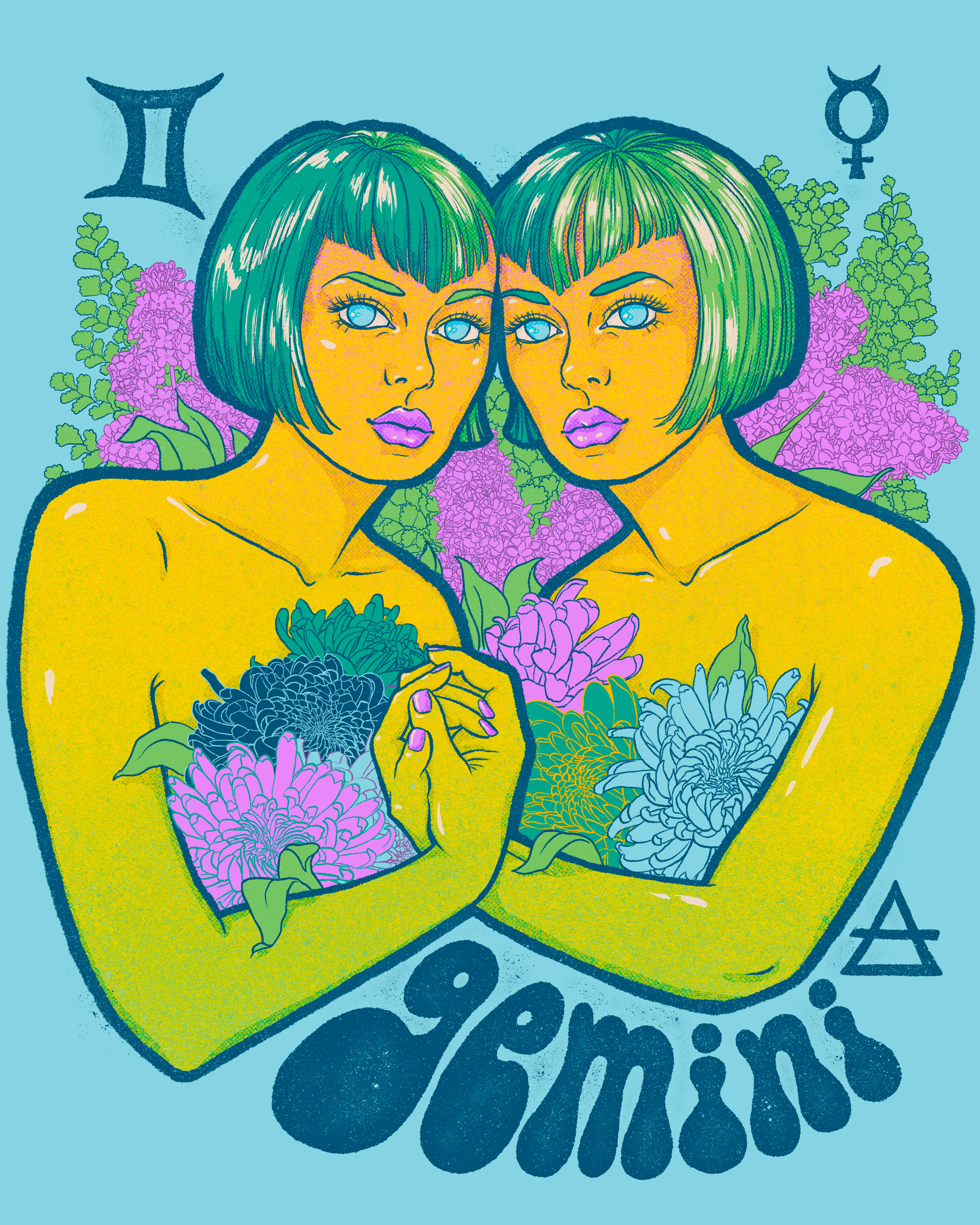 Gemini; the twins. Airy, ruled by Mercury. Birthdays May 21st—June 20th. Gemini notebook covers and art prints.